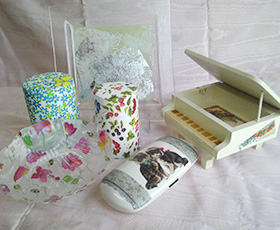 身の回りの物にペーパーを貼ってリメイクしてみませんか?雑貨や小物が自分テイストに生まれ変わります。初めての方でも簡単に、楽しみながら作って頂けます。資格取得コースもございます。